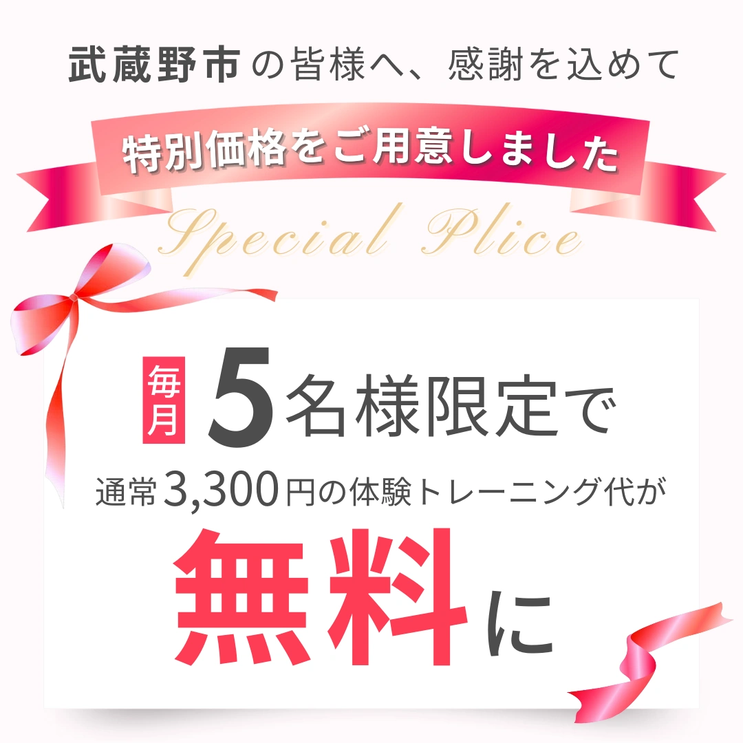 武蔵野市のお客様に感謝を込めて、毎月5名様限定で体験トレーニングを無料でご提供します!